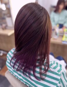 ピンクバイオレットは濃いめの色で入れるため、柔らかな質感でマットな印象になります。ツヤ感もアップするため、落ち着きのある髪色に仕上がりますよ!