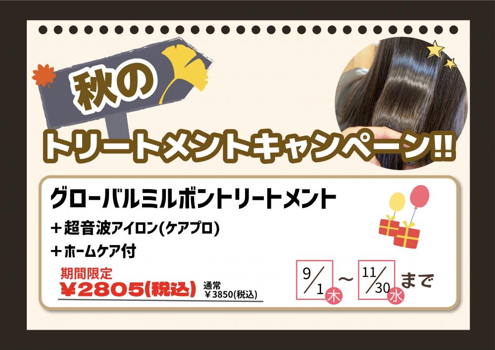 イングローブでは、9月から11月まで【トリートメントキャンペーン】をしております☆